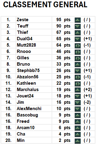 Désolé @Freed, je n’ ai pas fait attention que tu n’étais pas dans le classement général. Je règle cela demain et tu seras pour la peine 16eme :lol: :-p