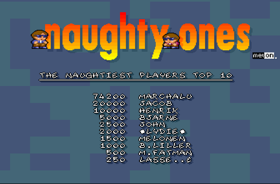 Il est à noter que ce jeu est une réalisation du groupe de Demomakers Melon Dezign. Actif dans les années 90 sur Ecs puis Aga, avant de passer au PC. Ils se sont remis à produire sur Amiga pas plus tard que l’année dernière. En collaboration avec CRYSTAL ils ont aussi officié en tant que groupe de pirates et laissé leur signature dans de nombreuses Cracktros. On appréciera l’ironie de la situation : ils ont pris la peine de protéger leur jeu Naughty Ones par un système anti-copie à base d’extrait de manuel à recopier. Il fut déplombé, bien évidemment, sans difficulté, par d’autres groupes de pirates concurrents.
