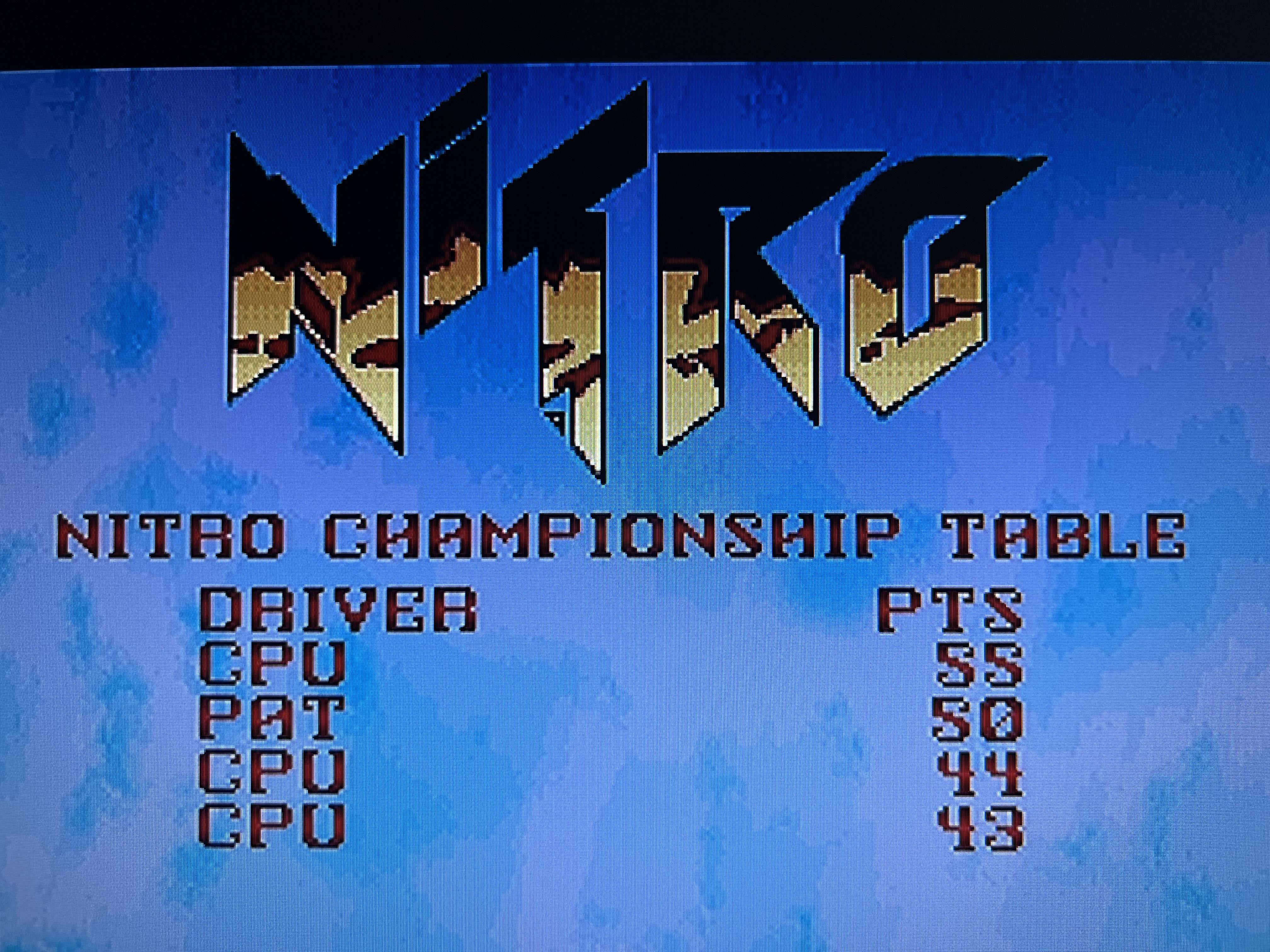 Ici, il s’agit d’un petit jeu de bagnoles (comme j’aime à les appeler) en vue de dessus. Un peu à la Micro-Machines, non seulement dans le sens où l’écran ne couvre qu’une partie de la piste mais aussi dans le principe que là aussi si le dernier des 4 bolides en course se retrouve trop éloigné du 1er, il sera alors aussitôt « téléporté » en avant! En mode multijoueurs seulement. D’ailleurs au passage, c’est suffisamment rare pour le saluer, mais Nitro propose de pouvoir jouer à 3 en même temps! Croyez-moi, si vous avez un jour l’occasion d’essayer, foncez!