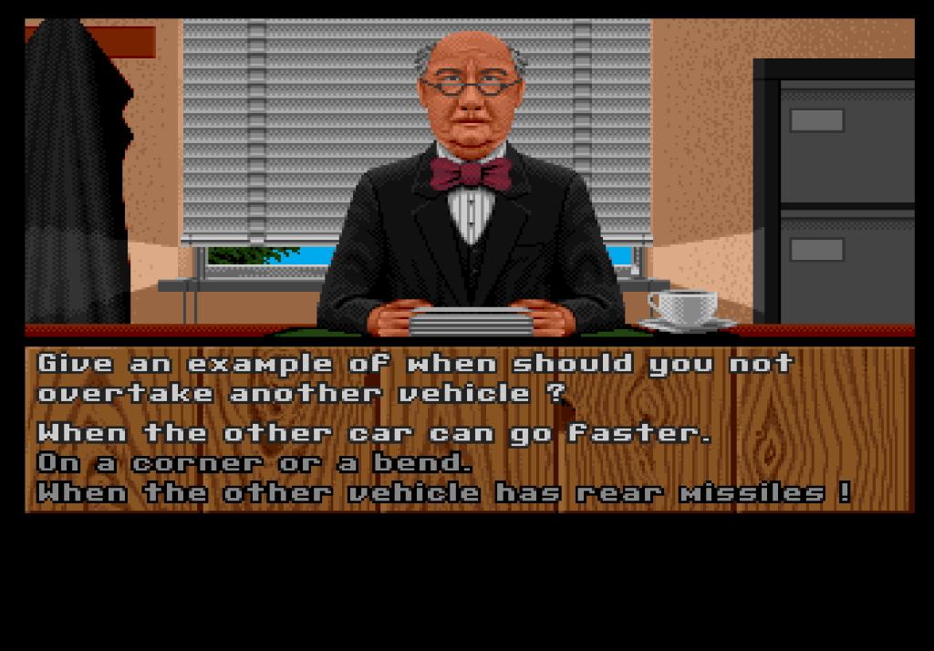 Vous aurez également de manière aléatoire entre les courses (c’est à dire on ne sait jamais quand!…) des entretiens avec divers intervenants: inspecteurs de police, avocats, et même des écolos etc… qui d’une certaine manière vont vous aider ou vous coincer!  Suivant leur fonctions, bien évidemment. :-p   Aussi, à chaque nouvelle question posée, vous risquez soit de perdre des points au championnat, ou bien de l’argent, mais aussi la possibilité de gagner un peu plus d’argent ou … de points au classement! A vous de bien répondre. Les réponses sont assez rigolotes, et si certaines fois ça ne parait pas évident, gageons que par élimination, la fois suivante … vous répondrez bien. :lol: