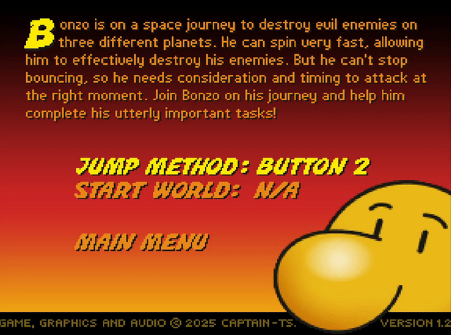 Bonzo est parti dans un voyage spatial pour détruire les ennemis maléfiques sur trois planètes différentes. Il possède une capacité très utile : il peut tourner très vite, ce qui lui permet de détruire efficacement ses ennemis. Mais il a aussi un problème : il ne peut pas s’arrêter de rebondir. Ses rebonds limitent ses mouvements, il doit donc compter sur sa réflexion et son timing. Rejoignez Bonzo dans son voyage et aidez-le à accomplir ses missions extrêmement importantes !