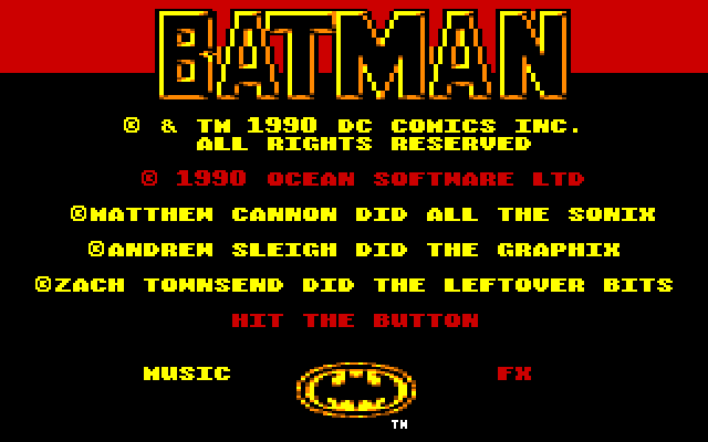 Basé sur le film Batman de 1989. Le jeu se compose de cinq parties différentes, chacune ressemblant à un type de jeu bien connu. Première partie, l’usine chimique : Chassez Jack Napier qui a dévalisé l’usine (action de plateforme typique, grimpez aux échelles ou utilisez la corde « Bat » et tirez sur certains ennemis…). Deuxième partie, « Batmobile » (…la voiture) : Le Joker vous poursuit et vous devez vous échapper vers la grotte de « Bat ». Evitez les obstacles comme la police qui bloque la route et d’autres. Troisième partie, « Bat »-cave : Un jeu de puzzle où vous devez trouver un certain objet (appartenant à Joker) parmi d’autres objets. Quatrième partie, « Batjet » : Coupez les cordes des ballons qui sont remplis de gaz toxique. Cinquième partie, la cathédrale : Traquer le Joker. Cette partie se déroule comme la première. Enfin, vous affronterez le Joker dans un combat qui décidera du sort de Gotham City.