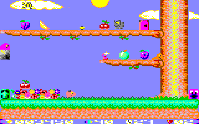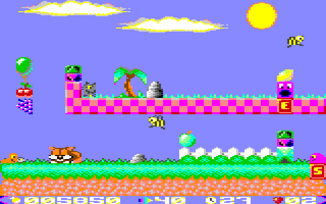 Bouncy Ball est un joli jeu de plateforme d’arcade coloré dans le style de Solomon’s Key ou Spherical . Vous contrôlez une boule rebondissante câline, qui peut évoquer des blocs et les éloigner à nouveau. Ces blocs peuvent être construits pour servir d’escaliers, de gangs ou de ponts. Le but du jeu est d’amener une balle, qui commence à rouler au fil du temps, vers une pierre cible. L’ensemble du jeu comprend 30 niveaux, chaque niveau étant équipé d’un mot de passe. Avec un mot de passe spécial, vous pouvez même déverrouiller un mini-jeu intégré. Bien sûr, vous ne devez pas toucher les adversaires tout aussi mignons qui rampent et jurent sur l’écran, sinon notre balle rebondissante perdra « de l’énergie ». Mais il y a quelques extras répartis dans les niveaux qui facilitent la vie de notre héros :
