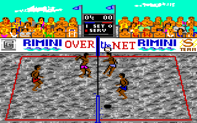 Vous pouvez jouer des matchs de volley-ball en 1, 3 ou 5 sets, chaque set étant remporté par le premier joueur à atteindre 15 points. Les équipes comprennent les Rollers, CoCo, les Beach Boys (jeu de mots évident dans leur nom) et les Geniases internes. L’action est vue de côté, avec l’ensemble du terrain visible. Lorsque la touche n’est pas enfoncée, les mouvements du joystick déplacent votre joueur dans cette direction ; lorsqu’elle l’est, il tente de frapper le ballon dans cette direction. Comme dans le vrai volley-ball, le ballon qui touche le sol de votre côté du filet, ou qui sort des limites du terrain sans rebondir, vous coûte un point.