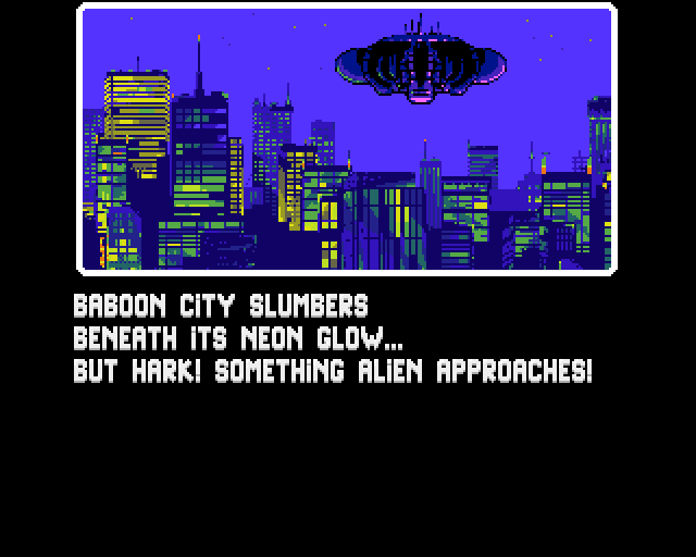Baboon City dort sous la lueur des néons… Jusqu’à ce qu’une invasion extraterrestre transforme ses citoyens en créatures sans cervelle. Mais l’espoir demeure. Deux guerriers émergent de l’ombre. Les Double Baboon Ninja ripostent.