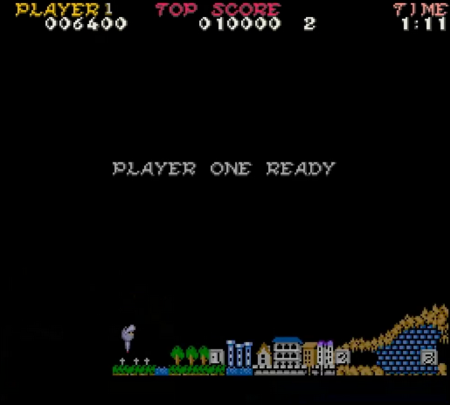 – changements sur l’écran principal : vous devez maintenant entrer le crédit avec le bouton 5, lorsque le crédit est entré, ‘appuyez sur 1 pour commencer’ apparaît, et le crédit est diminué en conséquence. – repositionnement de divers acteurs tels qu’Arthur, les zombies, les tombes, la torche lorsqu’elle brûle sur le sol. Ils sont maintenant cachés par deux lignes d’herbe dans le sol.