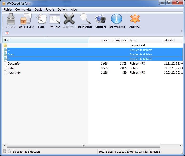 WinRAR permet bien d’ouvrir les archives .lha il suffit donc de copier les 3 dossiers (en bleu image ci-dessous) dans le dossier WB 3.1 (Windows demandera si on veut fusionner ces dossiers répondre oui)