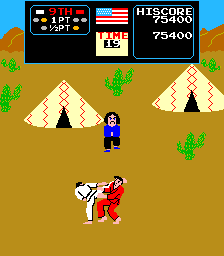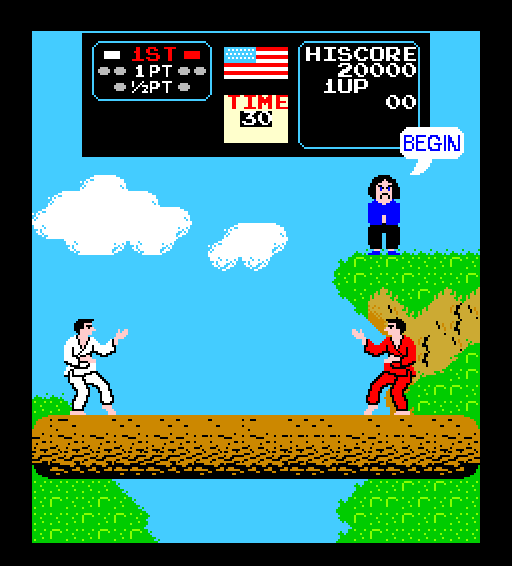Jeu de combat de 1984 développé par Technos Japan et publié au Japon en Arcade par Data East. Le jeu a ensuite été actualisé un peu plus tard, toujours publié par Data East sur Arcade, permettant à deux joueurs de s’affronter sous le titre Karate Champ – Player vs Player, comportant un mode multijoueur et un gameplay plus varié. Il est sorti au niveau international sous le nom de Karate Champ (la version originale à un joueur était exclusive au Japon) et a servi de base aux portages.