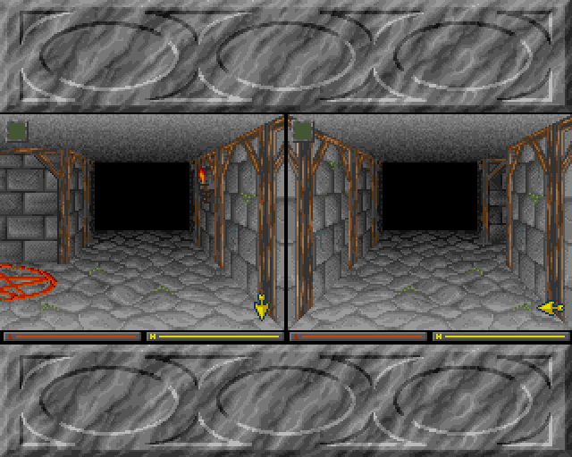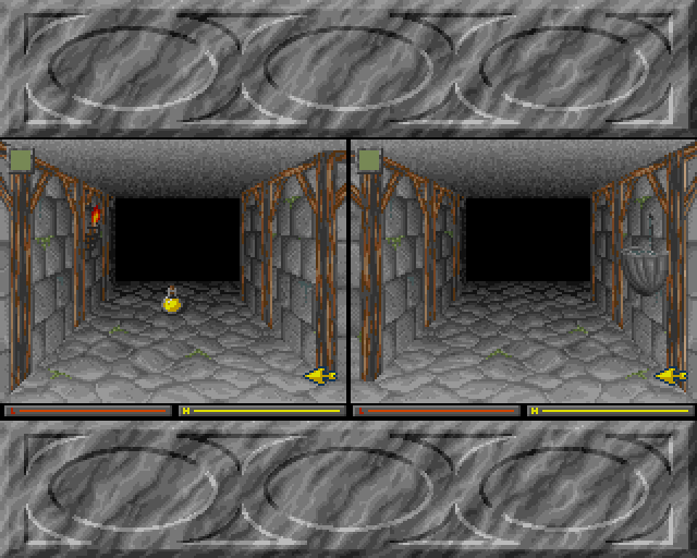 – Oeil magique : Ce sort permet de créer un œil magique volant qui peut être dirigé à travers le donjon. Vous voyez tout à travers la perspective de cet œil (votre quart d’écran obtient une bordure noire) et ne pouvez pas contrôler votre propre personnage pendant ce temps. Si vous appuyez sur feu, l’œil se transforme en une boule de feu qui peut frapper un adversaire ou détruire des murs illusoires . Vous regardez automatiquement le vol de cette boule de feu sauf si vous appuyez sur feu.