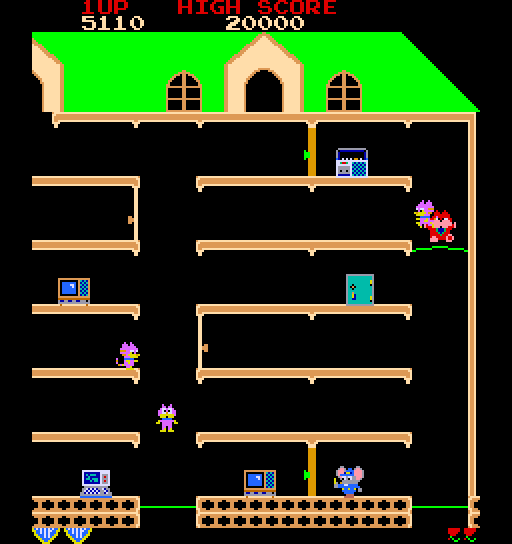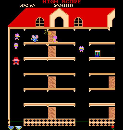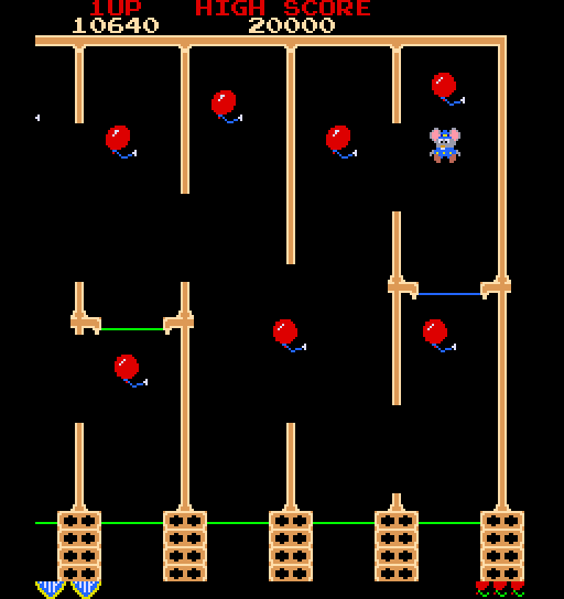 – En récupérant les deux objets d’une même paire consécutivement, ce qui multiplie la valeur du second. Le multiplicateur commence à deux à chaque nouveau tour ou vie, et augmente d’un point pour chaque paire supplémentaire d’objets consécutifs, jusqu’à un maximum de six.Les portes peuvent être ouvertes ou fermées à la fois par Mappy et les chats, et s’ouvrent toujours vers leur poignée. Pour ouvrir ou fermer une porte, le joueur doit se placer face à elle et appuyer sur le bouton. Tout personnage se trouvant près d’une porte sera brièvement repoussé et assommé si celle-ci s’ouvre vers lui. Les portes clignotantes libèrent une rafale de micro-ondes lorsqu’elles s’ouvrent, qui se propage horizontalement dans le sens de l’ouverture et balaye tous les chats pris dans son sillage pour gagner des points supplémentaires, qui sont doublés si Goro se trouve parmi eux. Après un court délai, ces chats reviennent dans le jeu depuis le bord supérieur de l’écran. Seul Mappy peut ouvrir une porte à micro-ondes, après quoi elle redevient une porte ordinaire que n’importe quel personnage peut ouvrir ou fermer.