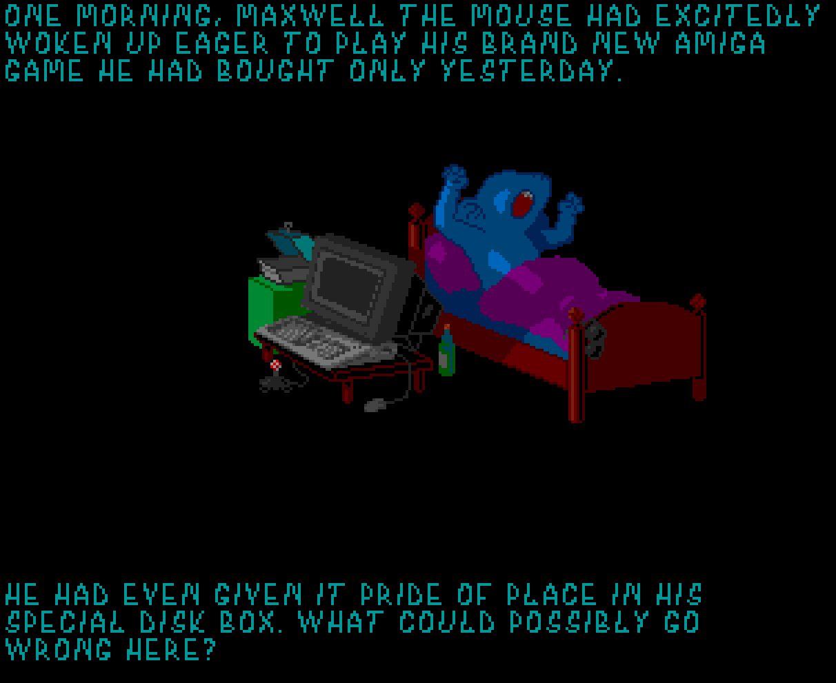 Maxwell, la souris bleue cool (qui insiste pour porter des lunettes de soleil et un sac à dos) venait de se réveiller après une nuit de sommeil très agréable. Il était enthousiaste car hier, il avait acheter un fabuleux nouveau jeu Amiga. Tout était prêt pour pouvoir jouer dès son lever.