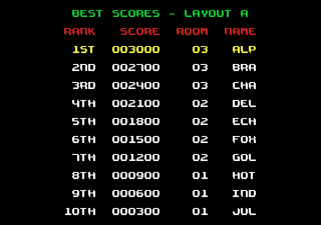 Le jeu comprend 70 niveaux au total. En choisissant la configuration A, vous jouerez les 35 niveaux les plus faciles. En choisissant la configuration B, vous jouerez les 35 niveaux les plus difficiles. En choisissant la configuration A+B, vous jouerez les 70 niveaux. Vous avez également la possibilité de vous entraîner dans une seule pièce de votre choix : placez la barre de sélection sur « PRACTICE ROOM ».