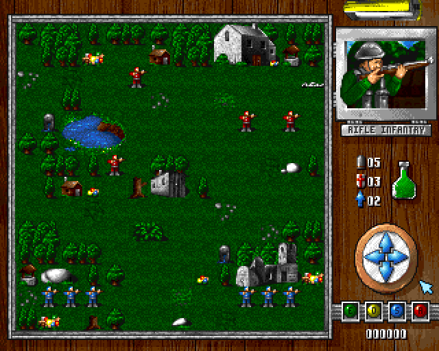 Sous la boussole se trouvent quatre icônes colorées, chacune avec une lettre dessus. Ils sont «E», «O», «S» et «A» Ils représentent la fin de tour, les options, les statistiques et le soutien aérien. Enfin, tout en bas se trouve un nombre à six chiffres indiquant le montant du financement dont vous disposez en livres (£) pour vous aider pendant le niveau.