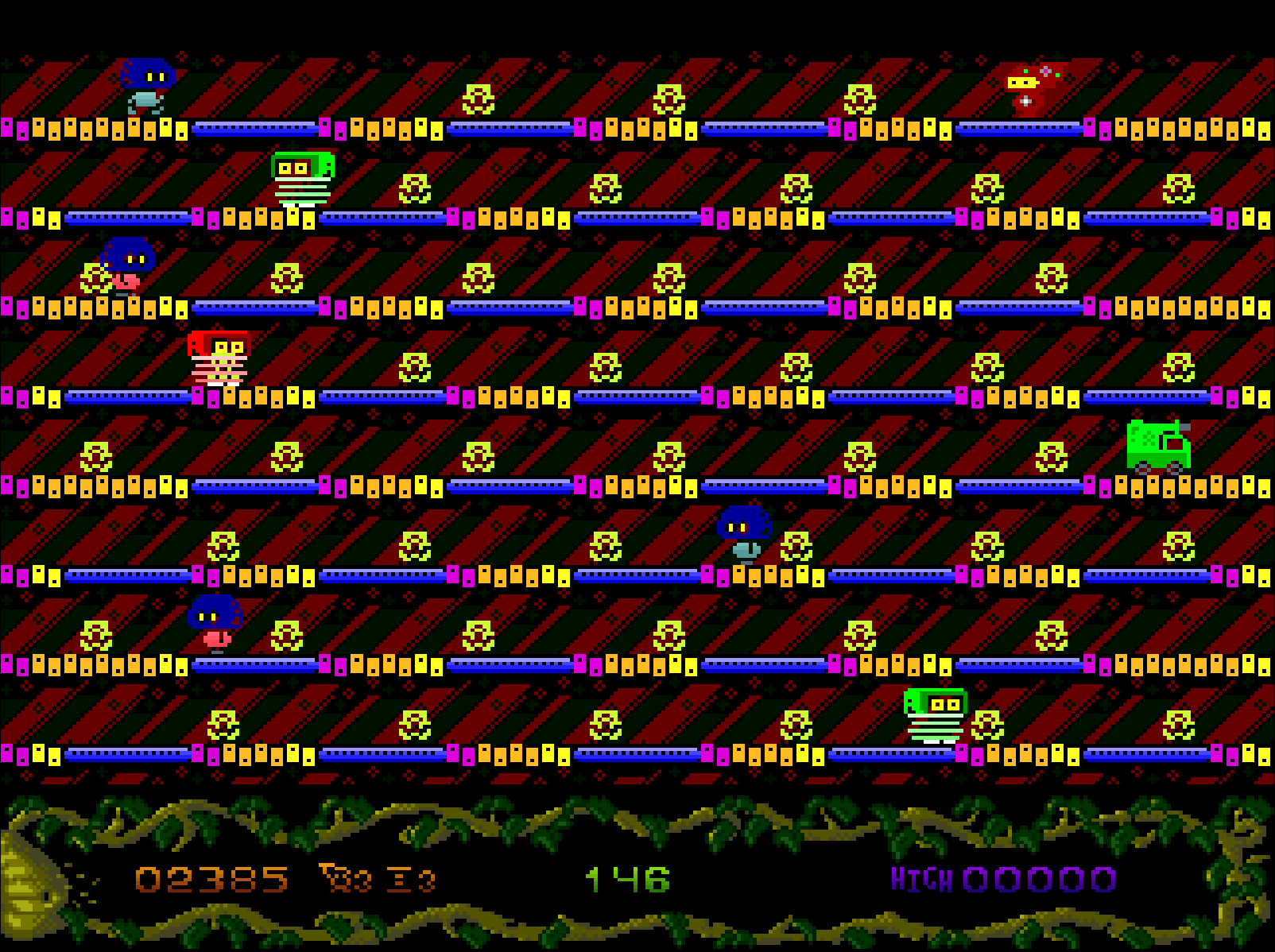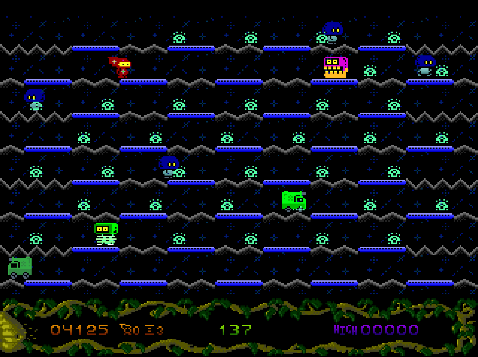 Évitez les gardiens extraterrestres pervers qui patrouillent dans les niveaux et faites attention aux bombes qui peuvent apparaître. Vous perdrez une vie si vous frappez un tuteur. De même, vous perdrez une vie si vous manquez de temps.