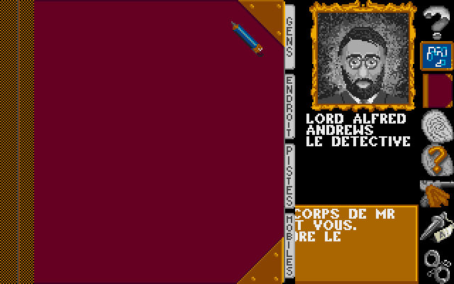 Icône carnetCliquez sur cet icône pour utiliser le carnet. Cliquez sur la section désirée avec le bouton d’action. Le carnet contient des informations essentielles pour commencer l’enquête ; l’heure et le lieu du meurtre, et qui trouva le corps. Vous pouvez y mettre d’autres informations à partir de la section d’interrogation. Les informations seront mises en référence. Tournez les pages en utilisant le pointeur de tourne-page. Quittez le carnet avec le bouton de mode.