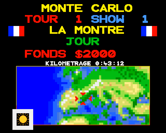 Lieu : Avant chaque course, un écran de Lieu apparaît, affichant les conditions météorologiques, s’il s’agit du jour ou de la nuit et le tarif de participation. Si vous n’avez pas suffisamment d’argent pour payer le tarif de participation, votre partie sera terminée et vous retournerez au Menu Principal.