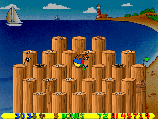 Vous guidez Pep sur un bâton pogo à travers un labyrinthe 3D, en évitant les dangers tels que les déversements d’hydrocarbures et les pièges. Le chien ramasse des os, des cornets de crème glacée et des bonbons pour gagner des points. Au fur et à mesure que le jeu progresse, des trampolines apparaissent, changeant le chemin de Pep.