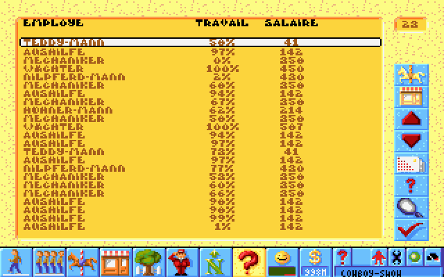 – Relevé de banque: Cliquez avec le bouton gauche pour voir votre relevé de compte. Vous n’y verrez pas de messages du style « votre parc est un fiasco… » Le relevé contient toutes les transactions financières effectuées au cours du dernier mois d’exercice. C’est un document très intéressant. Lorsque vous en avez assez vu, cliquez avec le bouton gauche sur la marque rouge pour revenir à l’écran du parc. Vous pouvez également activer directement le relevé de banque en cliquant sur l’icône de la banque avec le bouton droit.