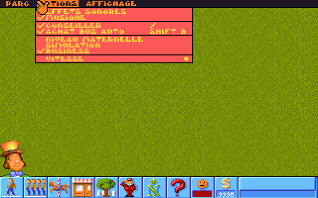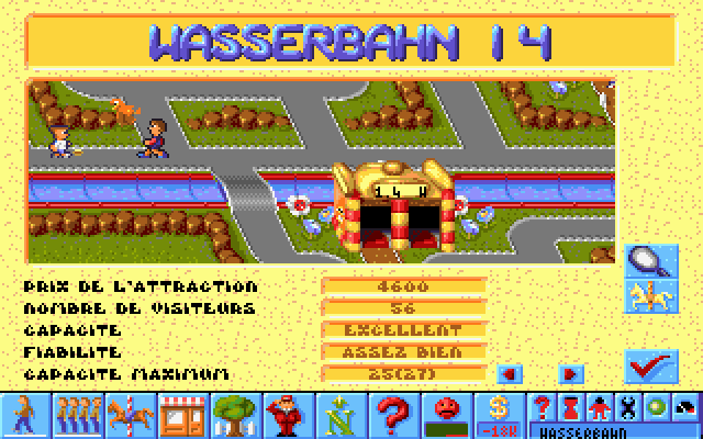 Astuce : Cela peut vous sembler très facile, mais si vous croyez que Theme Park sera une simple promenade de santé, vous n’y êtes pas du tout. Le succès dans les affaires demande une attention énorme pour les moindres détails, et c’est exactement la même chose dans Theme Park. Vous devrez gérer finement vos attractions, vos boutiques et vos spectacles pour faire un maximum de bénéfices. N’oubliez pas de vérifier régulièrement l’état de vos finances avec le Relevé de Banque, et écoutez mes conseils pendant le jeu.